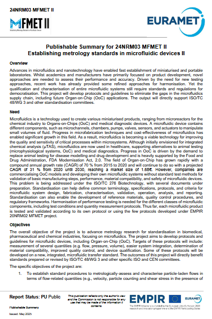 Today marks a significant milestone in the field of metrology standardization in microfluidics as the first publishable summary of the MFMET II project was officially released. This summary outlines the establishment of standardized measurement protocols and calibration methods essential for advancing microfluidic research and applications, in particular Organ-on-Chip.
