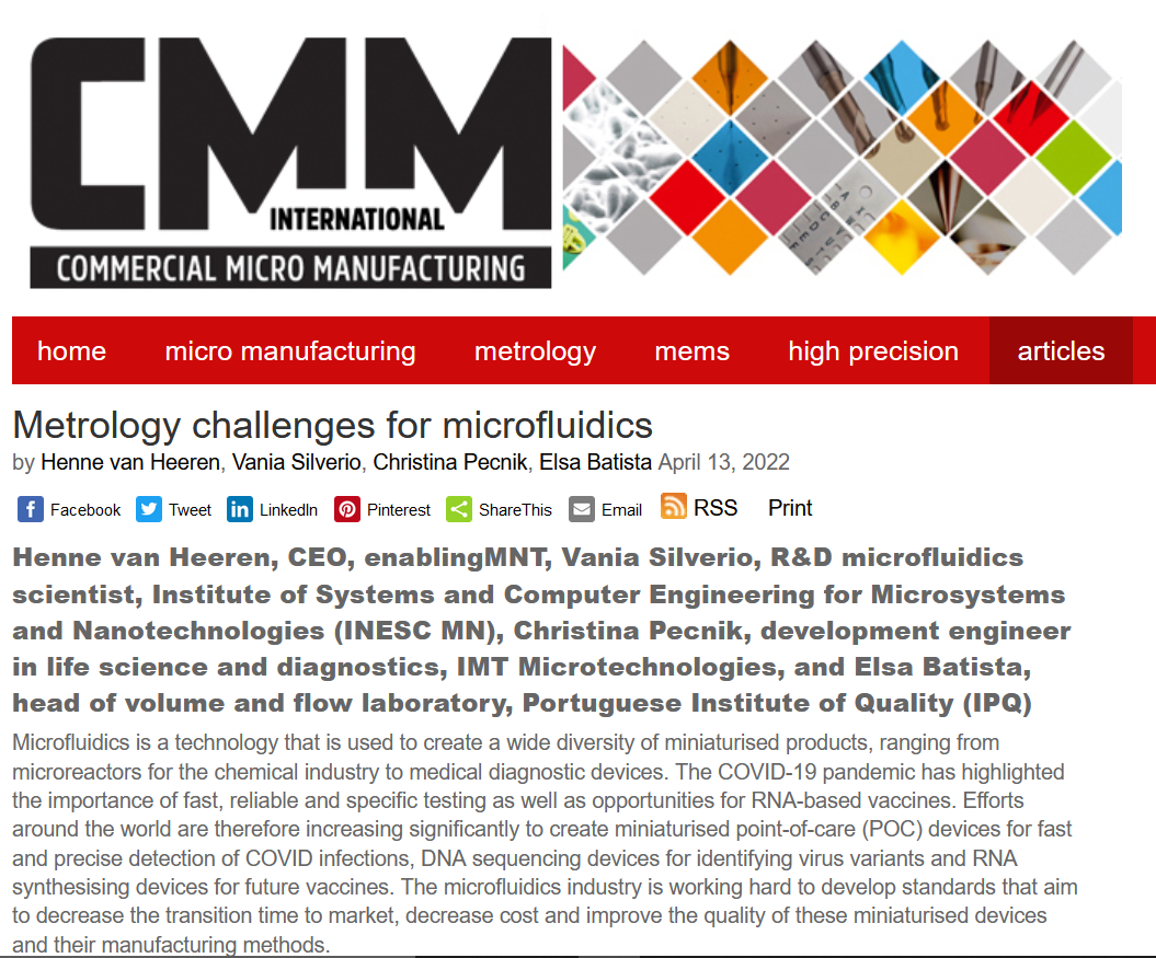 The work on “Metrology Challenges for Microfluidics” by Henne van Heeren (enablingMNT Group), Vania Silverio (INESC MN), Christina Pecnik (IMT Microtechnologies) and Elsa Batista (Portuguese Institute of Quality – IPQ), is on CMM Magazine